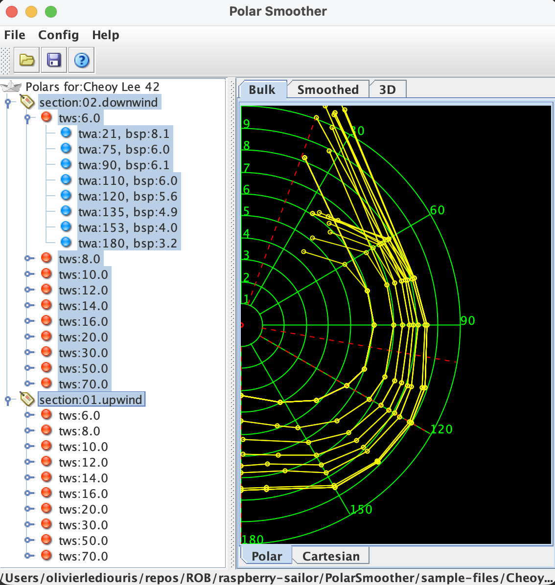 Voyez ci-dessus les intervalles de force de vent (tws), et d'angle de vent (twa). On attaque ces polaires avec un angle et une force de vent (réels ici),