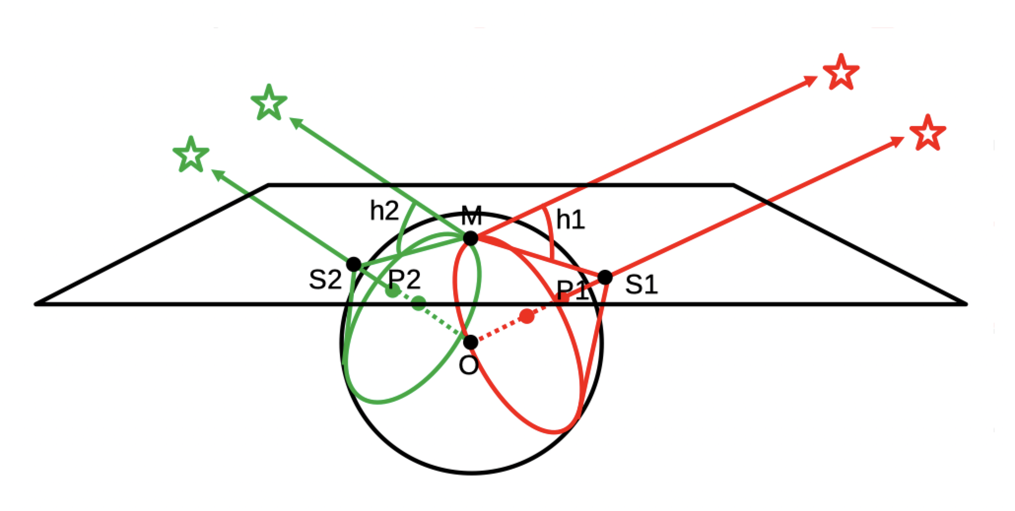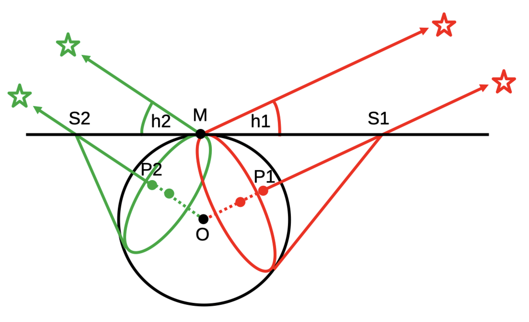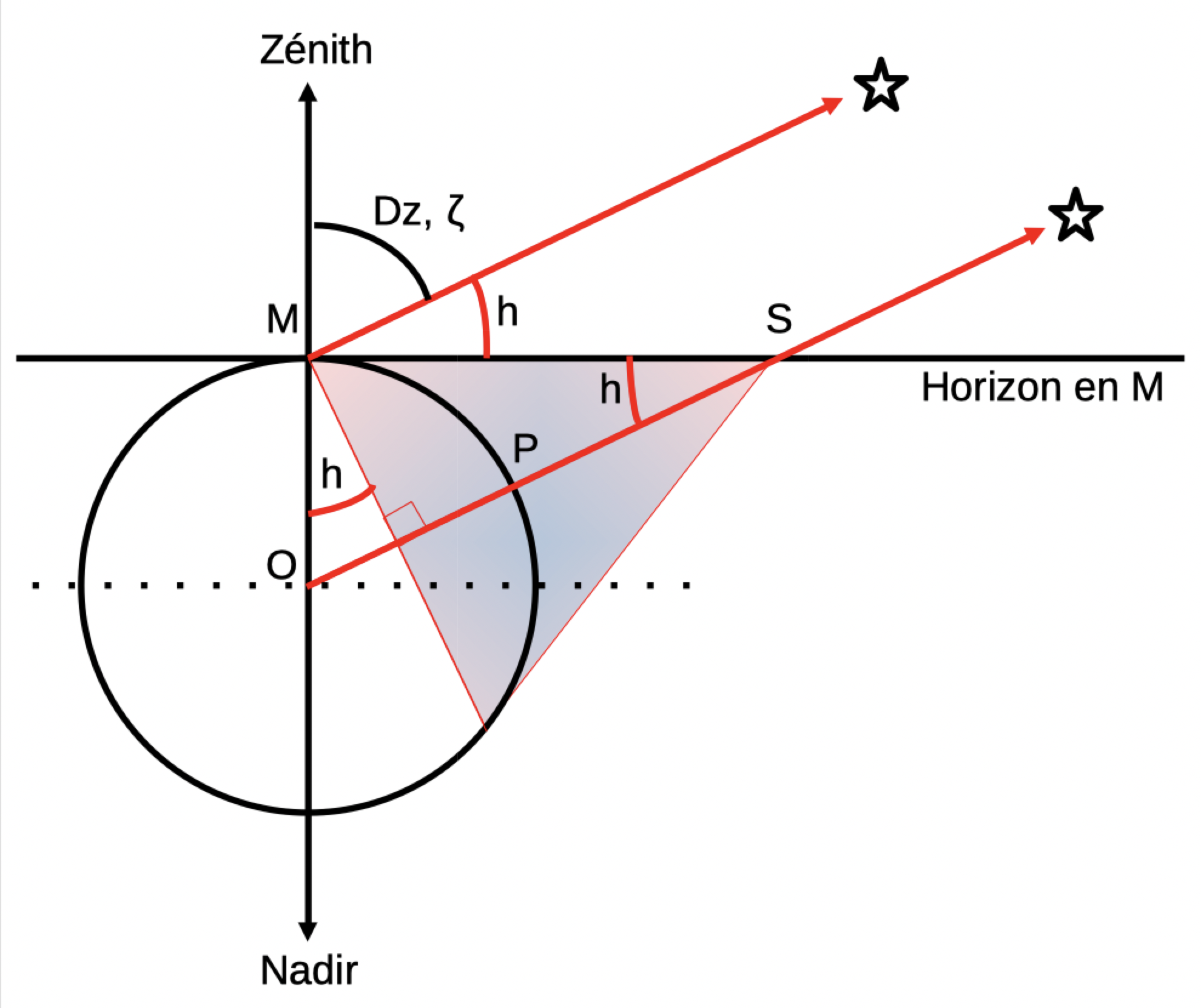 Note : sur la figure, la direction de l'astre à partir de M est identique (parallèle) à sa direction à partir de O.